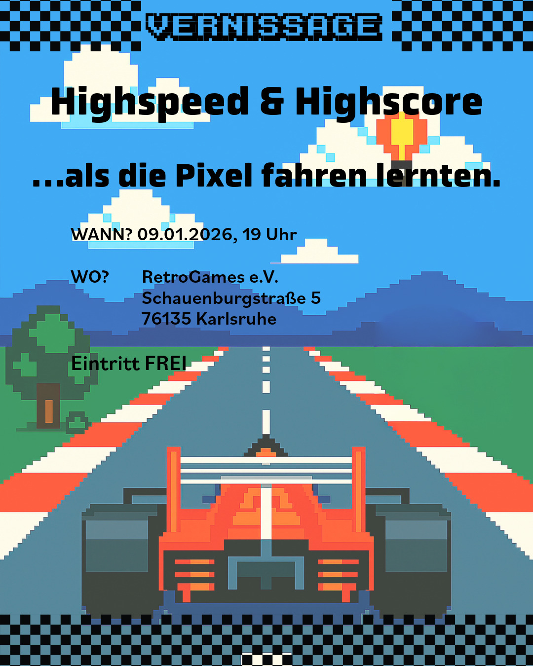 Einladung zur Vernissage “Highspeed and Highscore …als die Pixel fahren lernten”